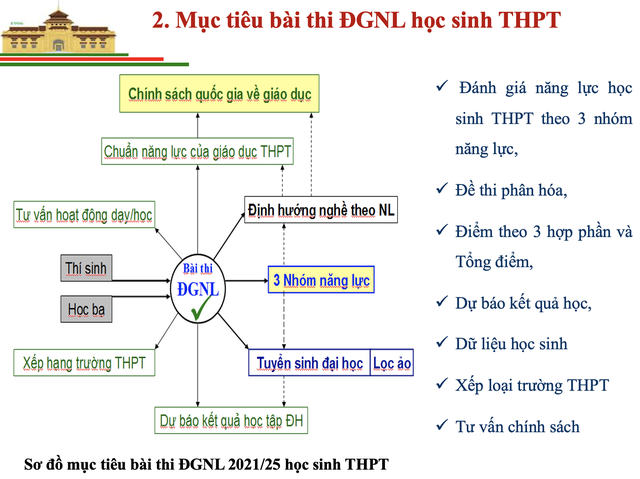 Do đó, kết quả bài thi ĐGNL hướng tới nhiều mục đích: đánh giá năng lực học sinh THPT để phân loại sau khi tốt nghiệp THPT; tư vấn cho hoạt động dạy và học, đảm bảo chất lượng giáo dục; dự báo chất lượng nhân lực phổ thông; phục vụ công tác tuyển sinh và dự báo kết quả học tập bậc đại học; hướng nghiệp cho học sinh…