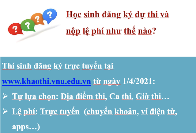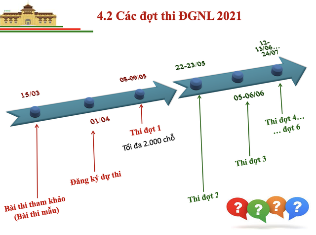 Năm nay, Trung tâm Khảo thí ĐHQGHN sẽ tổ chức nhiều đợt thi, kéo dài từ tháng 5 đến tháng 11. Thí sinh đăng ký trực tuyến đợt thi đầu tiên từ ngày 01/04/2021 tại địa chỉ www.khaothi.vnu.edu.vn. Thí sinh được lựa chọn ngày thi, ca thi, đợt thi phù hợp với kế hoạch cá nhân; được thay đổi thời gian thi trước 14 ngày dự thi. ĐHQGHN ứng dụng tối đa công nghệ thông tin để tăng tính chủ động cho thí sinh và tiết kiệm chi phí xã hội.