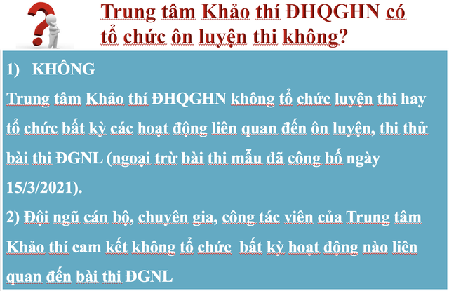GS.TS Nguyễn Tiến Thảo cho hay, đề thi được rà soát từ hơn 12.000 câu hỏi của ngân hàng đề thi ĐGNL năm 2016 để lựa chọn những nhóm câu hỏi phù hợp với 3 nhóm năng lực xác định nêu trên, kết hợp với hơn 3.500 câu hỏi được xây dựng trong giai đoạn 2017 - 2020. Với số lượng câu hỏi phong phú sẽ đảm bảo tính toàn diện của kỳ thi, đáp ứng sự cân bằng độ khó của từng đề thi cho mỗi học sinh tham dự nhiều đợt trong năm. Bài thi mẫu sẽ được công bố trước ngày 15/3/2021.